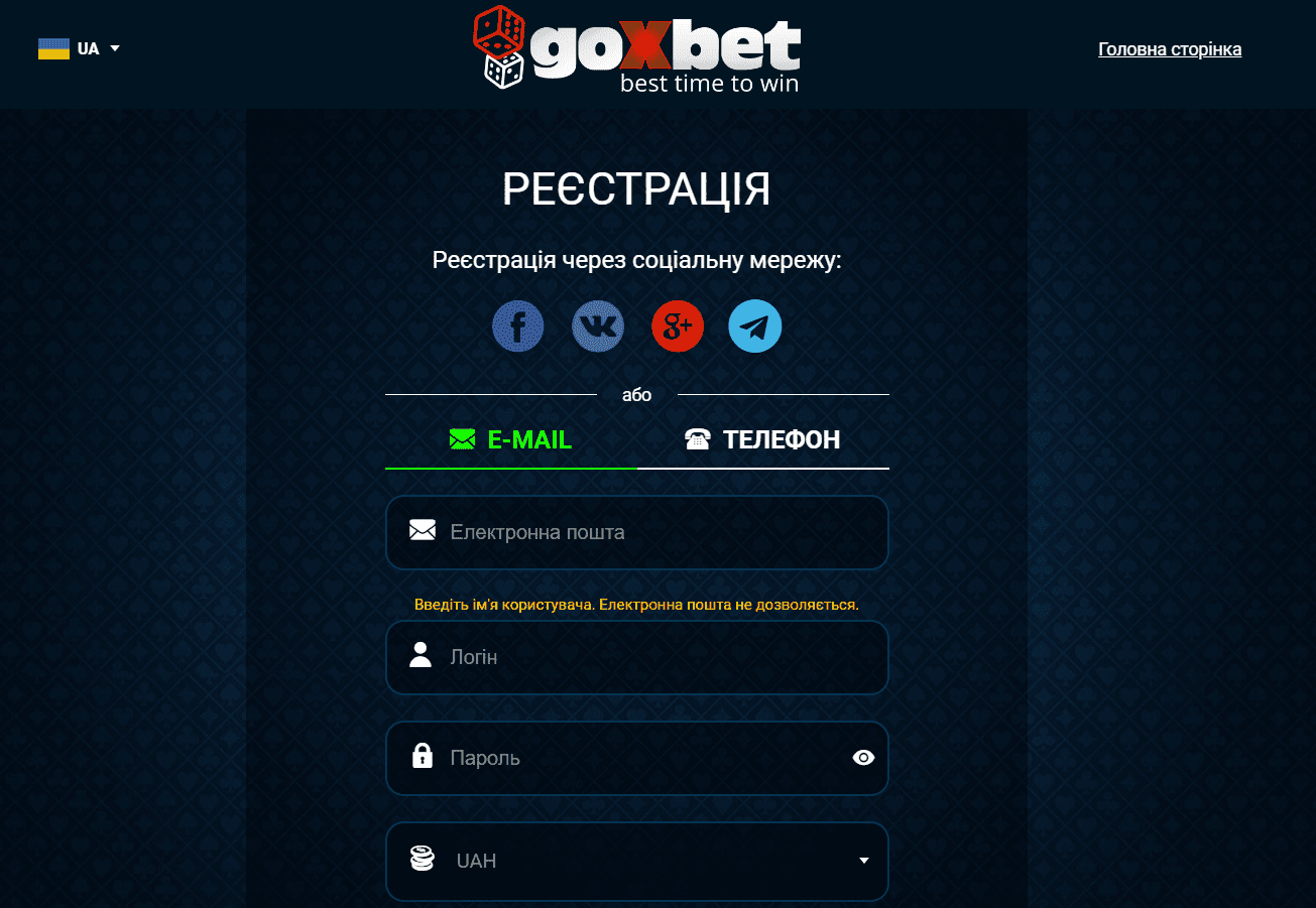 - Перший крок — вибір платформи. Переконайтесь, що це надійний та безпечний ресурс, якому можна довірити свій час та гроші. Наприклад, онлайн-казино «Goxbet» пропонує не лише величезний вибір гральних автоматів, але й чесну гру, вітальні бонуси та інші заохочення.